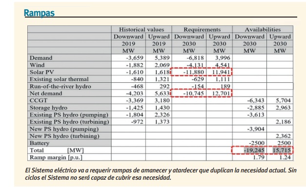 Los autores del estudio han tomado el Plan Nacional Integrado de Energía y Clima (Pniec versión 2020) y se han puesto a hacer números. Se han puesto a medir rampas y a hacer números (por rampa se entiende la bajada de la fotovoltaica al anochecer o la subida de la generación solar al amanecer); y lo que han observado es que en 2019 había una rampa al amanecer, de bajada, de 4.200 MW. Y que al atardecer la rampa era a subir, y las necesidades, 5.600 MW (año 2019).