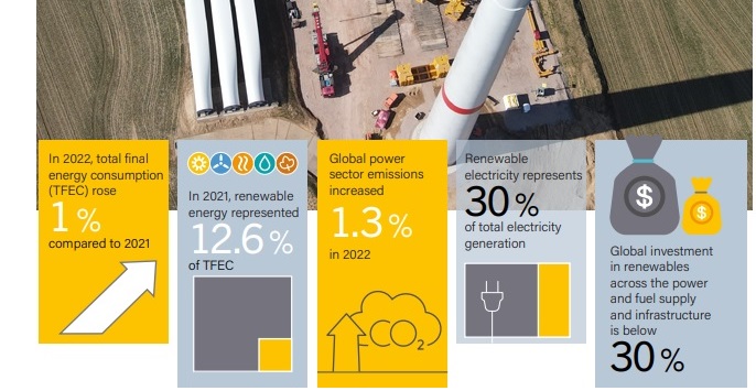 Aunque las economías emergentes y en desarrollo representan dos tercios de la población mundial, estas -concreta REN21- solo recibieron una quinta parte de la inversión mundial en energías renovables en 2022. A pesar de los numerosos desafíos sociales, económicos y geopolíticos a nivel mundial, la inversión en energías renovables alcanzó un récord de 495.400 millones de dólares estadounidenses en el año 2022, pero esta cifra sigue palideciendo en comparación con los 1,1 billones de dólares estadounidenses invertidos en combustibles fósiles. En 2021, los bancos privados destinaron 395.000 millones de dólares a proyectos de combustibles fósiles y sólo 53.000 millones a energías renovables.